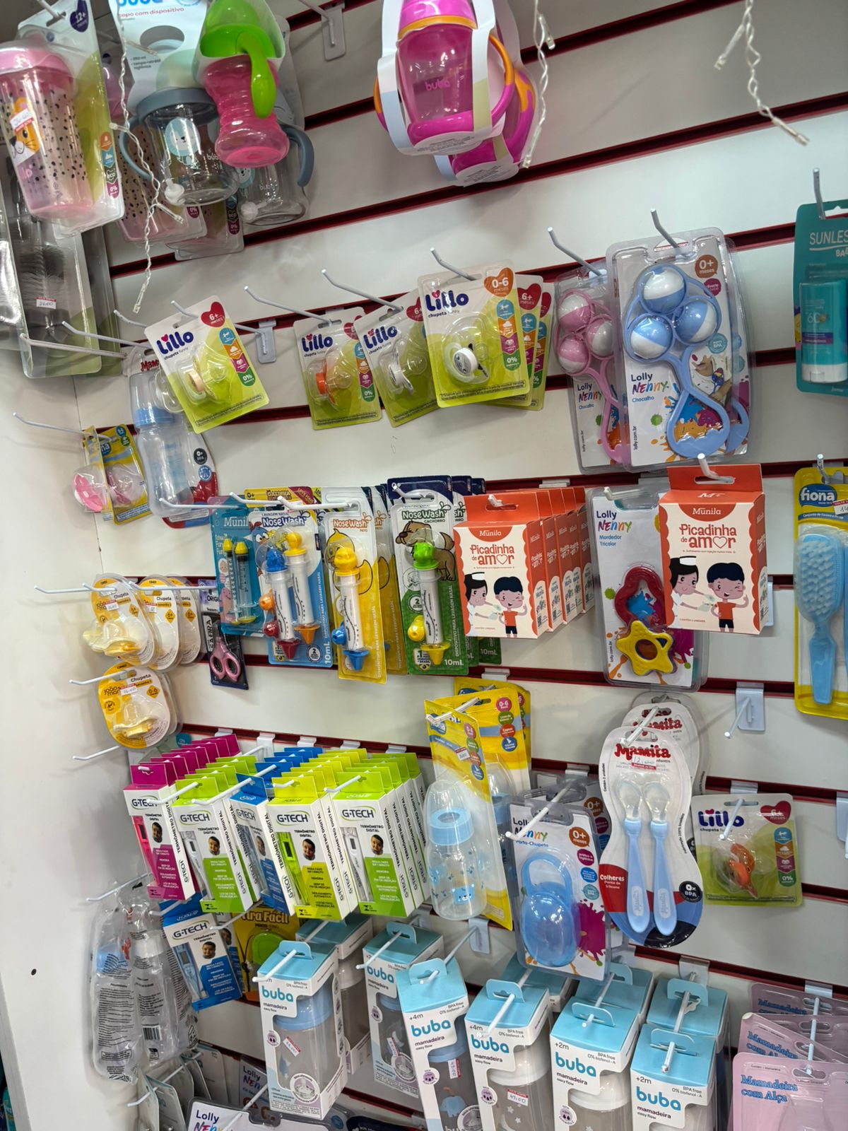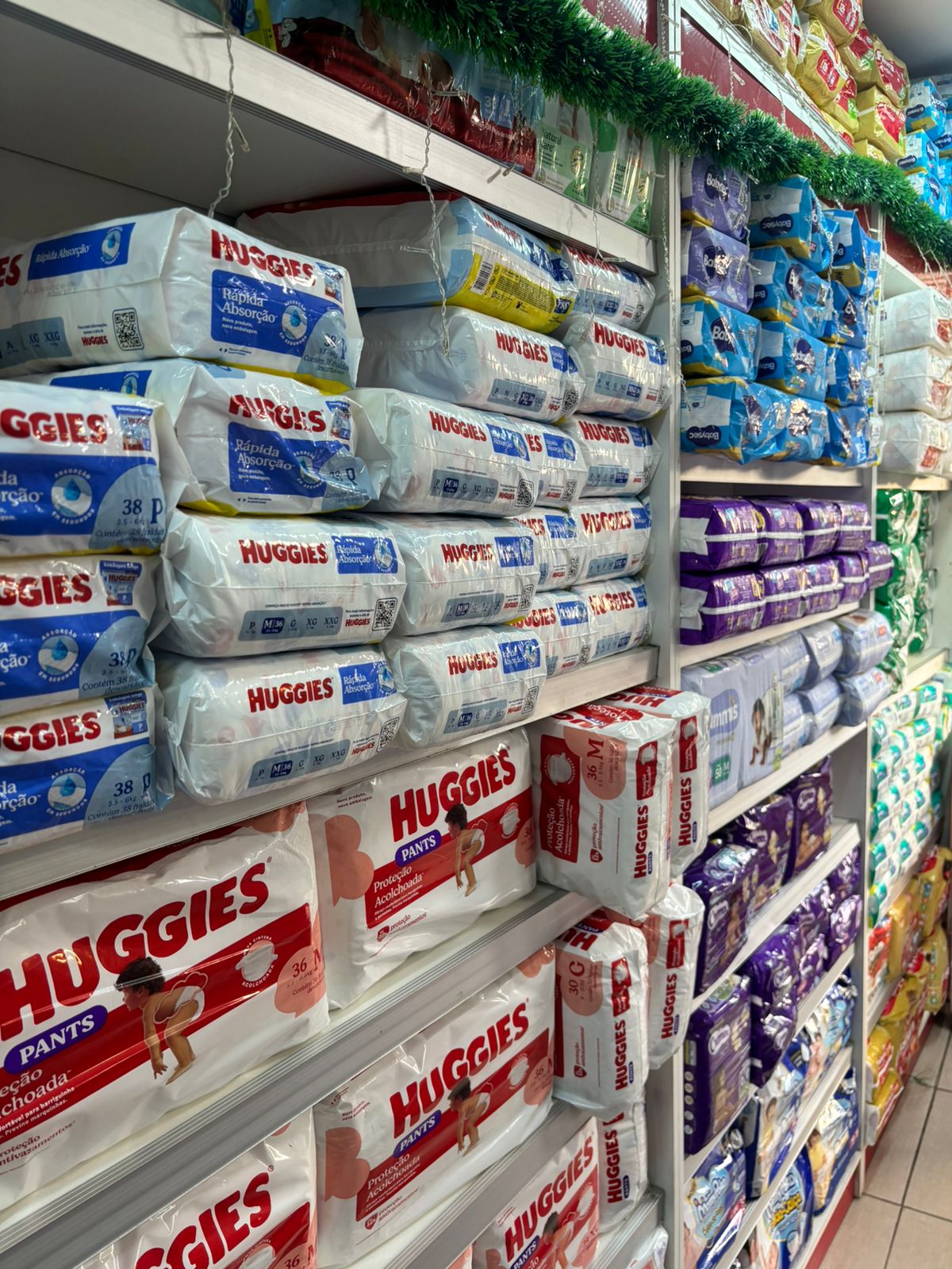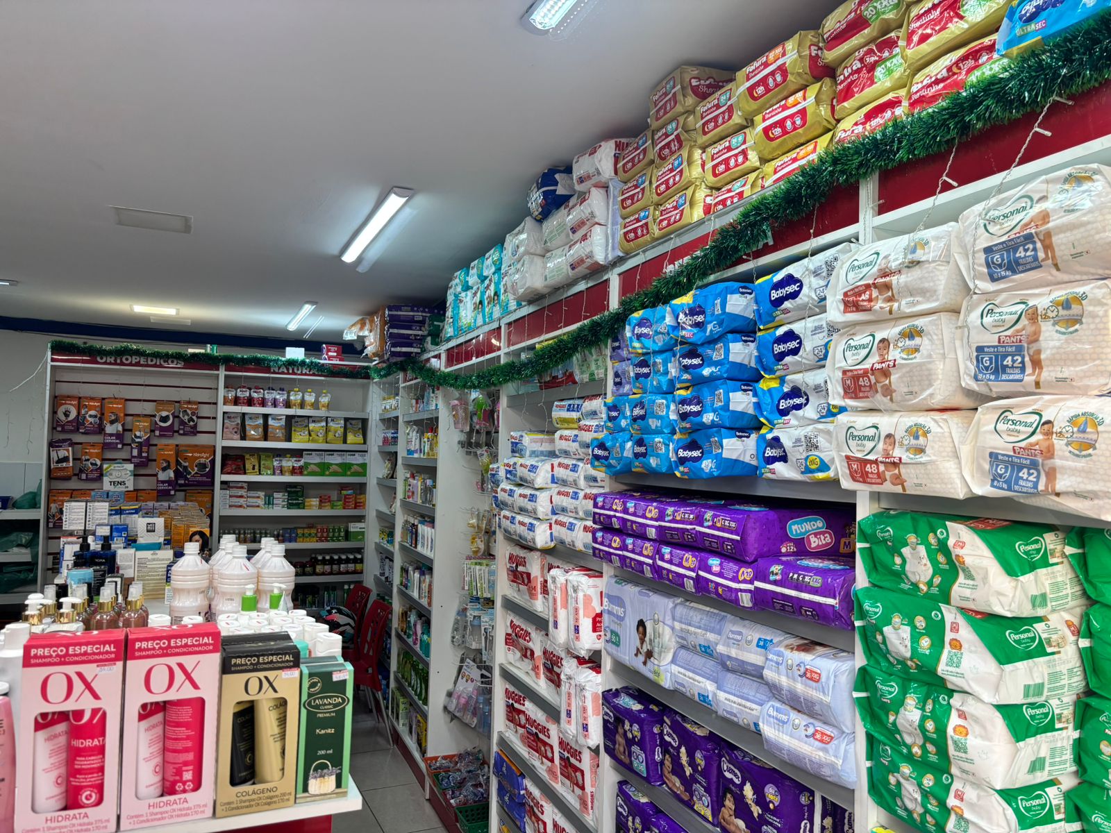 Cosméticos, higiene pessoal e uma seção infantil completa com fraldas e acessórios.